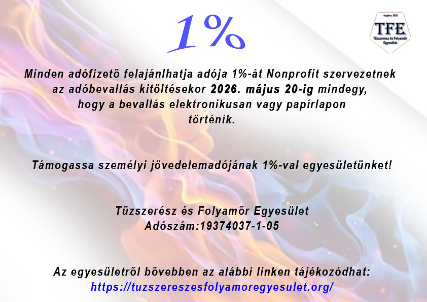 Minden Adófizető felajánlhatja adója 1%-át nonprofit szervezetnek az adóbevallás kitöltésekor 2026. május 20-ig. Mindegy, hogy a bevallás elektronikusan vagy papírlapon történik. Támogassa a személyi jövedelemadójának 1%-ával egyesületünket! Tűzszerész és Folyamőr Egyesület: Adószám: 19374037-1-05 .